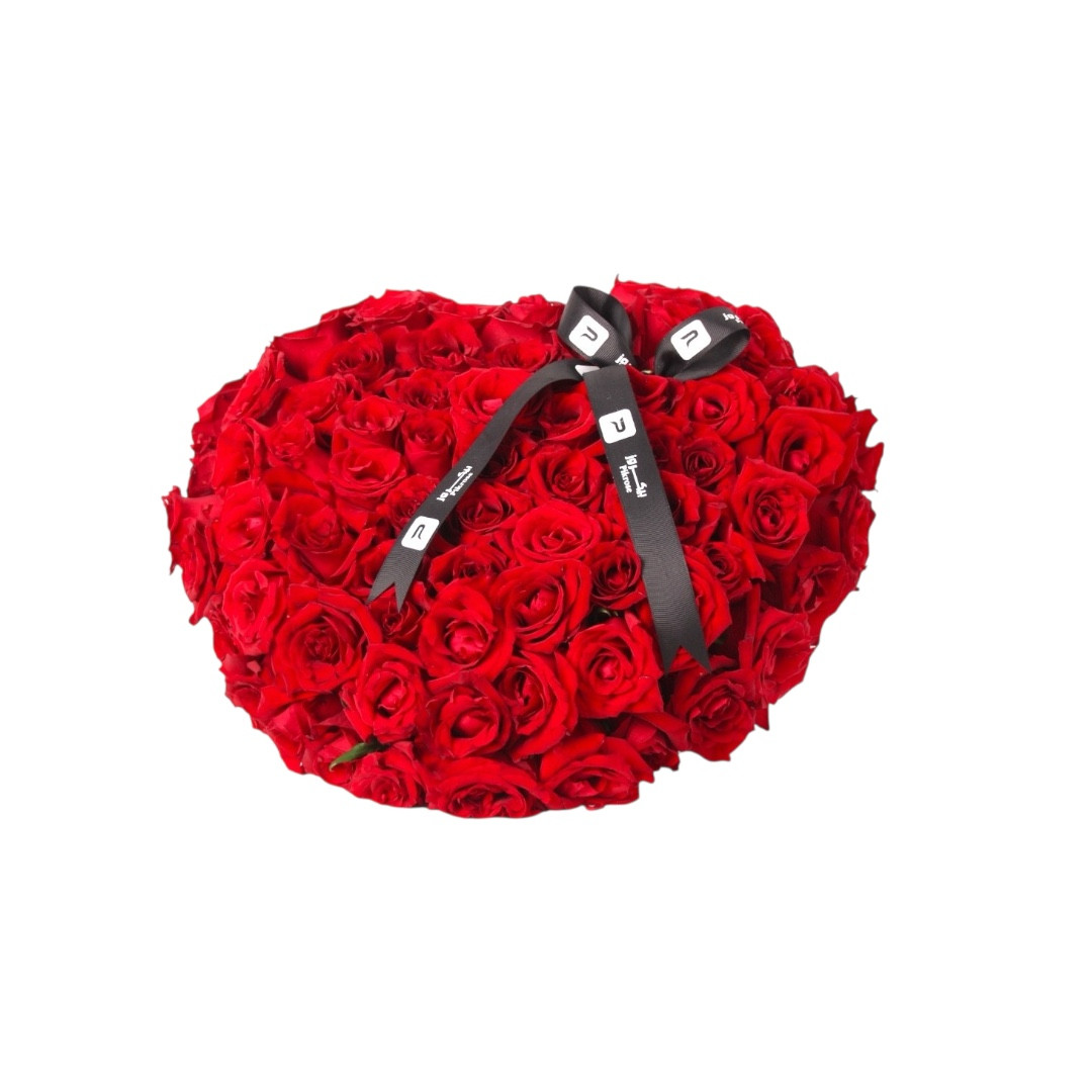الجوري الاحمر | قلب : "تنسيق رومانسي لورود جوري حمراء كثيفة على شكل قلب، مزينة بشريط أسود أنيق."