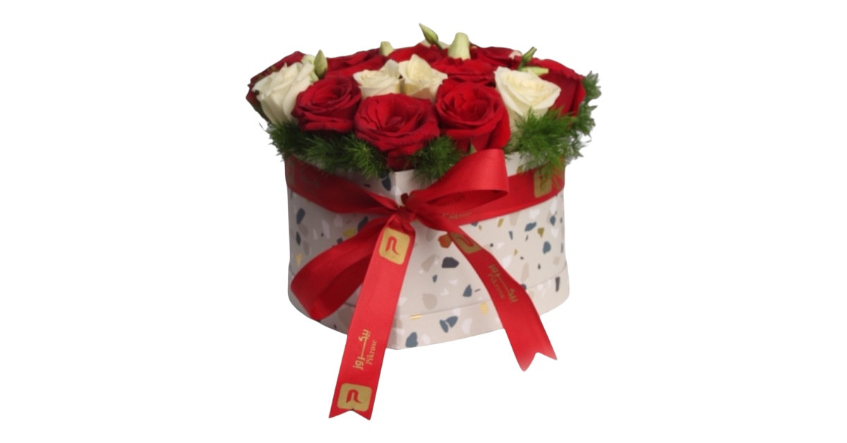 فؤادي | صندوق : . نوعان من ورود الجوري الاحمر والابيض على شكل قلب . صندوق قلب . شريط احمر
